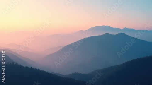 Layers of misty mountains at sunrise with a gradient sky transitioning from pink to blue.