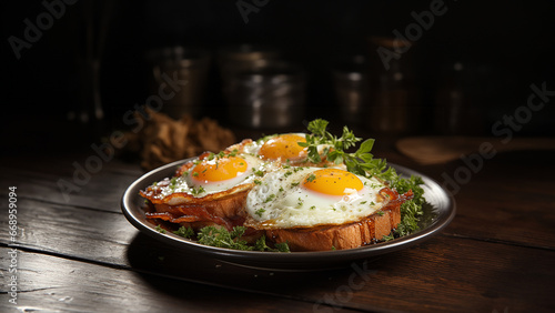 Leckere gebratene Spiegel Eier mit Toast Brot und Speck, garniert mit Petersilie und grüne Gewürze, ai generativ