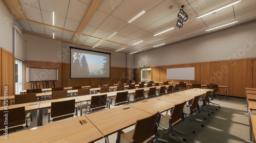 Lecture Hall with Wooden Desks and a Projector