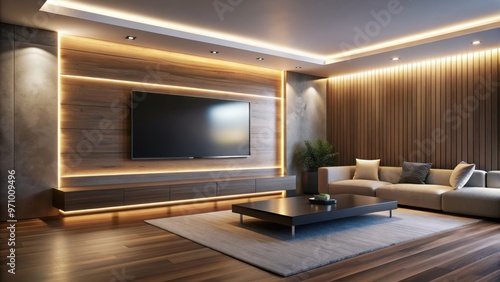 LED-backlit TV wall in modern media room, technology, entertainment, television, interior design
