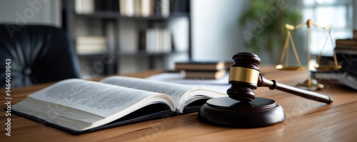Legal Desk Setup with Gavel, Open Book, and Scales of Justice