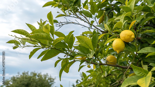 Lemon garden in Italian Amalfi coast ready for harvest. Bunches of fresh yellow ripe lemons with green leaves