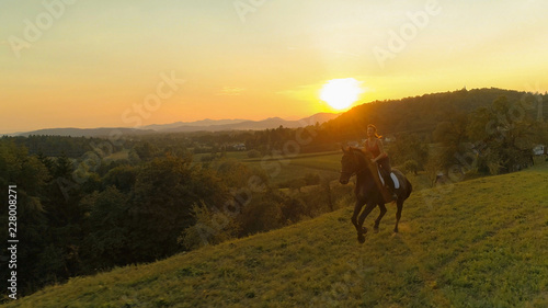 LENS FLARE: Energetic horse gallops through countryside with woman on its back.