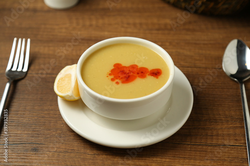 Lentil soup with a slice of lemon