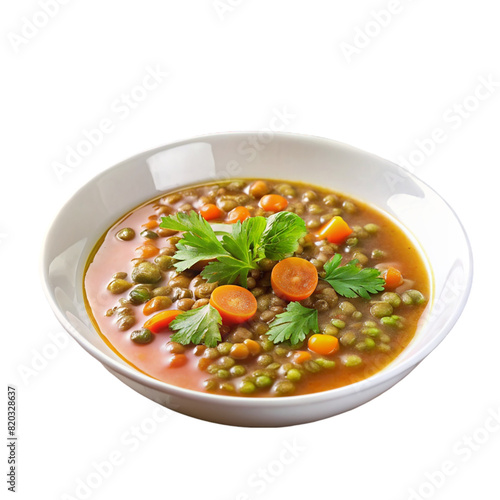 Lentil soup with carrots and celery on white plate Isolated on transparent background