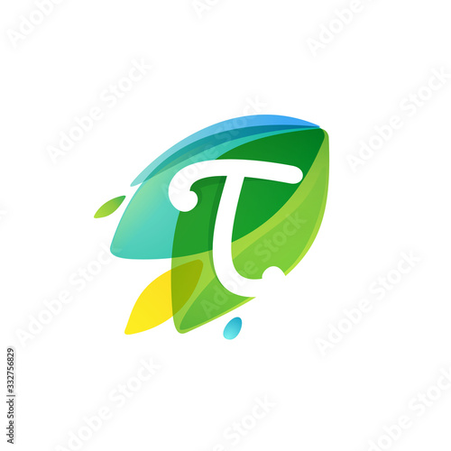 Letter T logo in dynamic leaves intersection shape.