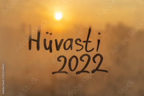 lettering Huvasti in Estonian is goodbye in english and numbers 2022 paint with finger of water on splashed by rain foggy glass on sunset window