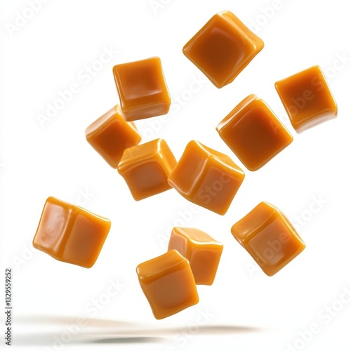 Levitating Golden Caramel Candy Cubes in Dynamic Motion with Light and Shadow Play