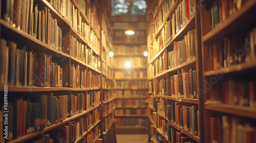 Library filled with shelves of books, featuring diminishing perspective and shallow depth of field