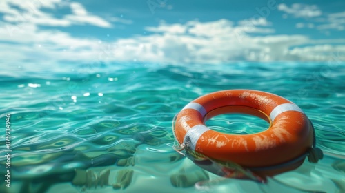 Life buoy floating on the ocean surface, vibrant colors and realistic water texture, 3d rendering.