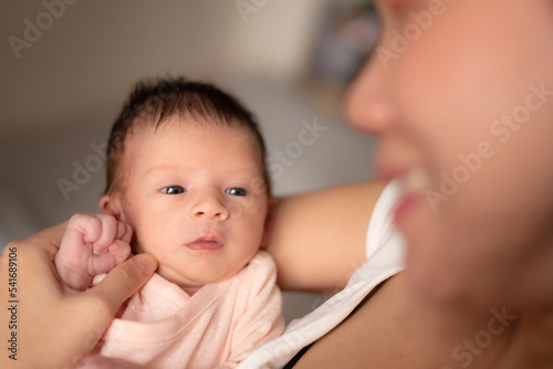 lifestyle shot on young and happy Asian Chinese woman holding tenderly her adorable newborn baby girl in her arms in mother and daughter love and care concept