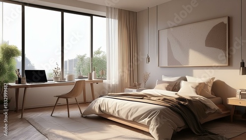 Light bedroom interior with bed and workplace near window, mockup poster
