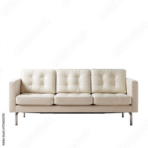 Light beige leather three-seat sofa with button tufting and chrome legs