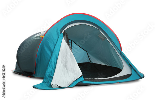 Light blue camping tent on white background