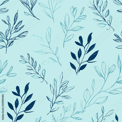 Light Blue Vector Seamless Pattern with Delicate Botanical Illustrations