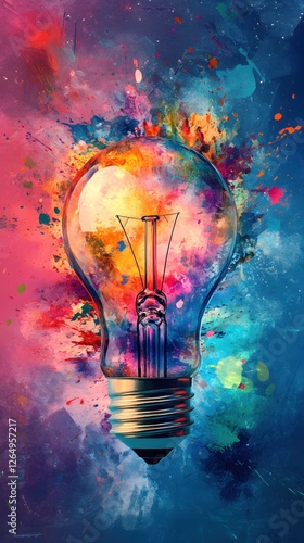 Light Bulb Amidst Vibrant Splashes of Color Symbolizing Creative Idea and Artistic Expression