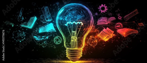 Lightbulb bursting with vibrant symbols of education, knowledge, and creativity, including books, pencils, gears, and abstract ideas, innovative learning process, AIgenerated