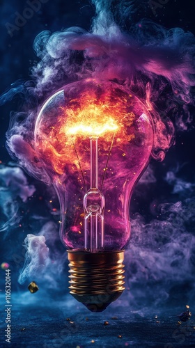 Lightbulb explosion with colorful particles and abstract rays