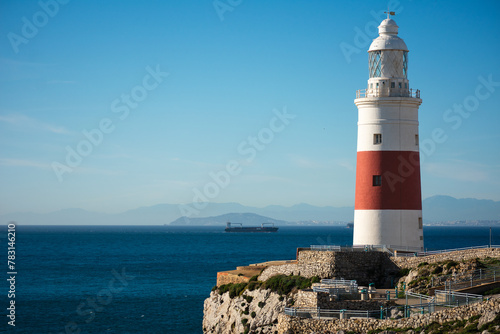 lighthouse at point europe in gibraltar, the southernmost point of europe, where you can appreciate the proximity of the african continent.