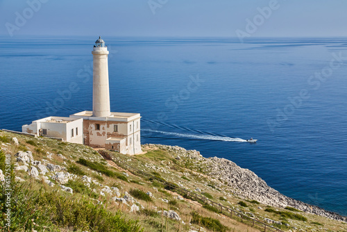 lighthouse of Cape of Otranto in Apulia standing on hard granite rocks is the most easterly point of Italy, marks the meeting of the Ionian Sea and the Adriatic Sea.