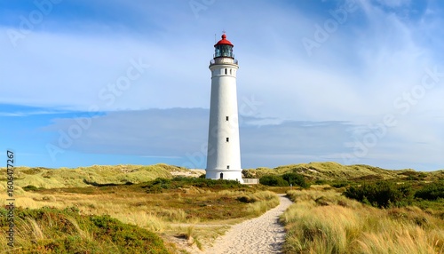 Lighthouse on a sandy beach, sunny day