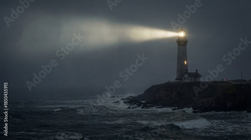 Lighthouse Shining Bright Beam Through Fog And Stormy Night