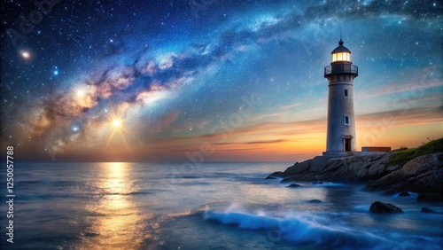 Lighthouse towering above the calm sea under a celestial canvas of stars on a moonless night with the gentle lapping of waves against its base, coastal scenery, celestial landscape