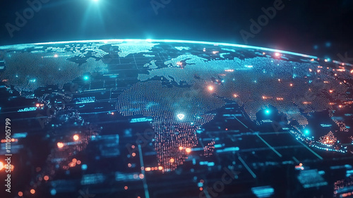lights illuminates a detailed map of the world with technology concept, map world animated connections and data streams global business infrastructure technology abstract background with lights.