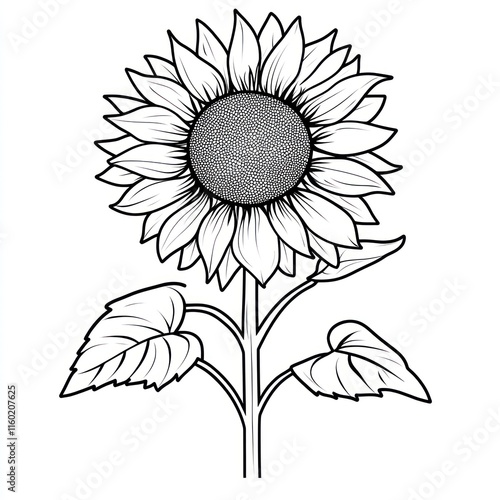 Line art drawing of a single sunflower with leaves and stem. (1)