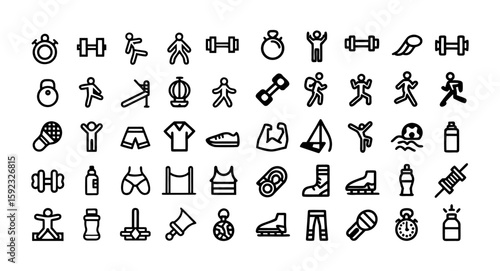 Line Art Fitness Icon Set – Minimalist Vector Illustrations of Dumbbell, Yoga Pose, Running Shoe, and Water Bottle for Workout and Wellness Designs