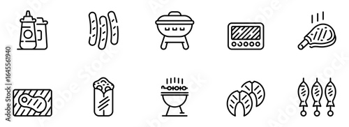 Line art icons: grilling, BBQ, food, meat, fish, vegetables, sauces, bread, kebabs, summer, picnic, restaurant menu, simple, minimalist, black and white.