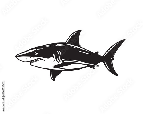 Line art illustration, black and white, shark with iridescent reflections. Soft dreamy atmosphere, vector