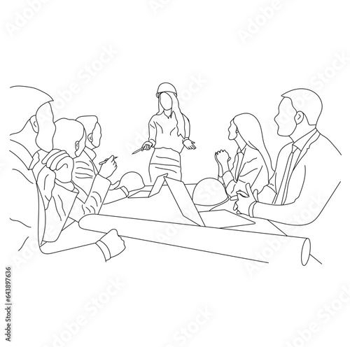 Line art of architect-engineer discusses a construction project in a meeting room isolated on a white background.