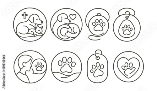 Line style icons of veterinary care (circular): end-of-life care icon, pet hospice badge, comfort plan ring, quality of life chart, grief support bubble, farewell pawprint icon, memorial tag,