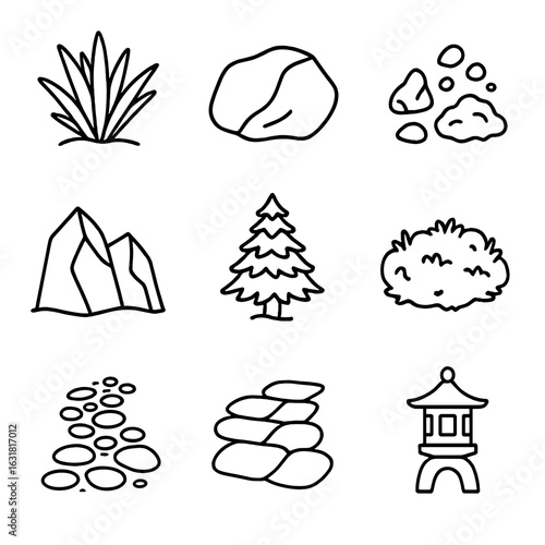 Line Style Rock Garden. Line style icons of Rock Garden Elements: alpine plant, boulder rock, scree gravel, crevice stone, dwarf
