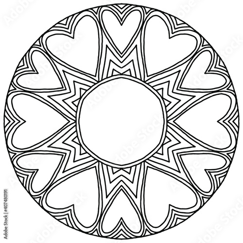 linear hearts and ornaments forming a mandala drawn on a white background for coloring, vector, mandala