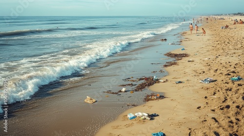 Littered beach with ocean waves and people.