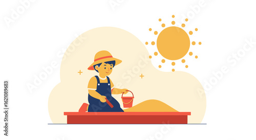 Little Boy Enjoying Summer Day Playing With Sand In Sandbox Illustration