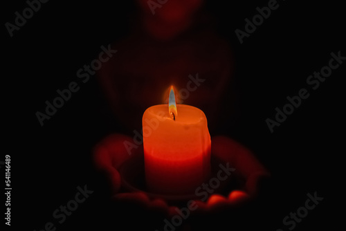 Little boy holding red burning candle in the darkness.Selective focus.Closeup.