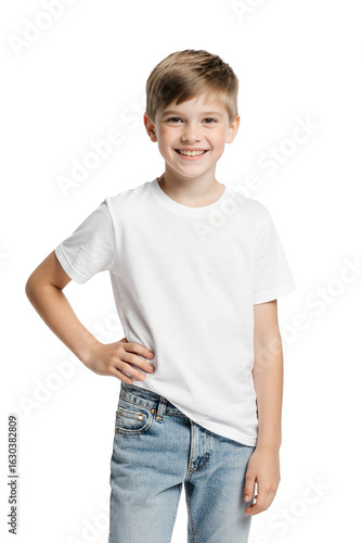 little boy wearing white t-shirt and blue jeans, isolated on transparent background