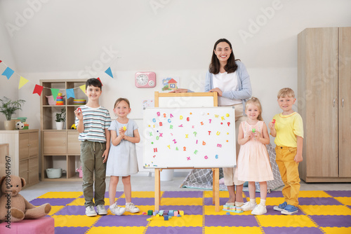 Little children with nursery teacher learning letters in kindergarten