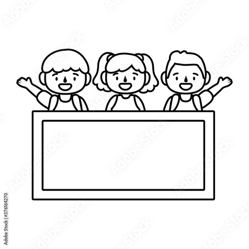 little students kids with chalkboard characters line style