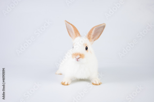 Little white and brown rabbit eating cabbage on isolated white or old rose background at studio. It's small mammals in the family Leporidae of the order Lagomorpha. Animal studio portrait.