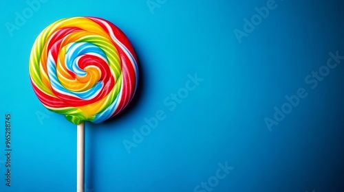 Lively spiral lollipop showcased on a bright blue surface conveys a sense of fun and sweetness, perfect for advertising seasonal treats.
