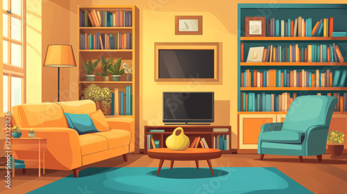 Living room interior set with sofa, pear chair, bookshelves and tv. Vector cartoon furniture collection for house, modern decor, floor lamp and rear view of couch isolated on white background