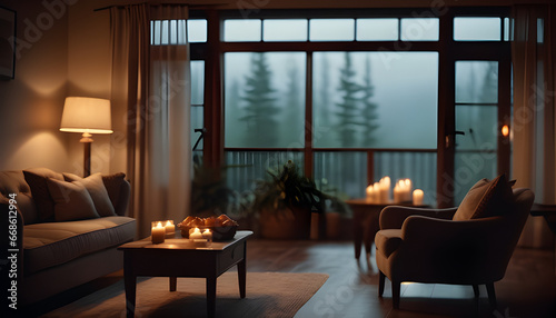 living room open window rainy atmosphere peaceful style