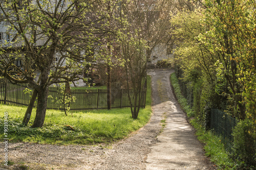 Ländlicher Weg mit Bäumen und Holzzaun