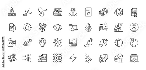 Lock, Computer mouse and Charging time line icons pack. AI, Question and Answer, Map pin icons. App settings, Delete file, Talk web icon. Vector