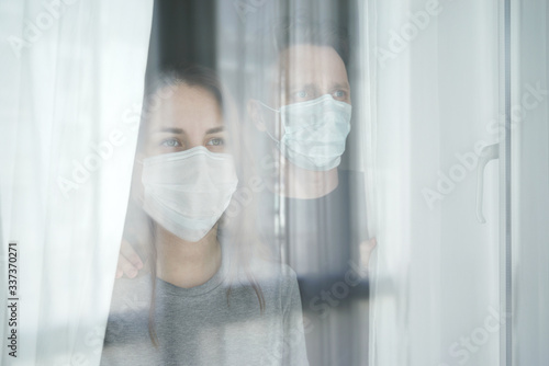 Lockdown. Couple Looking Out The Window on Quarantine. Coronavirus.