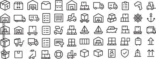 Logistics and Shipping Icon Set Depicting Cargo, Transportation, and Delivery Related Symbols for Supply Chain Management
